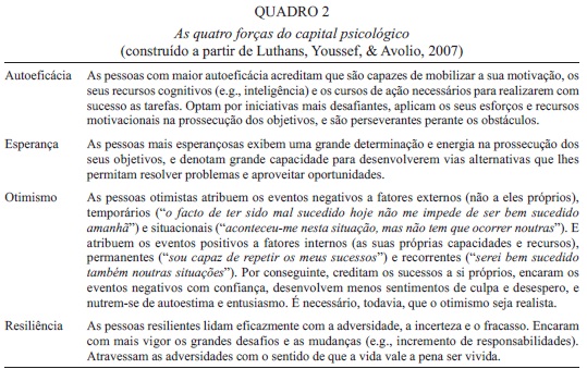 As características e ações individuais têm um impacto no funcionamento e na eficácia das organizações superior ao frequentemente assumido (Mollick, 2012). Um dos alvos de maior investigação nos estudos organizacionais positivos tem sido o capital psicológico positivo, construto que abarca quatro forças: autoeficácia, esperança, resiliência e otimismo (Quadro 2). As investigações (Avey, Reichard, Luthans, & Mhatre, 2011; Youssef & Luthans, 2012) sugerem que o capital psicológico dos colaboradores gera atitudes e emoções mais positivas (e.g., satisfação, empenhamento, felicidade), conduz a melhores níveis de desempenho (próprio do papel e extra-papel), e dificulta a emergência de atitudes e comportamentos negativos como o cinismo, os desejos de abandono da organização, e ações desviantes. A investigação também sugere que o capital psicológico, quando presente em larga escala, aumenta a competitividade das organizações (Luthans & Youssef, 2004) e o desempenho das equipas (Walumbwa, Luthans, Avey, & Oke, 2011).