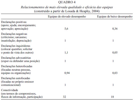 As interações desempenham um papel crítico na criação de organizações positivas. Sem interações, muitas ações e caraterísticas individuais revelar-se-iam pobres e incapazes de edificar a positividade das equipas e das organizações. As interações entre líderes e liderados, já aludidas a propósito da atuação dos líderes autênticos, são cruciais na construção da positividade. Mas em todas as interações no seio das equipas e das organizações existe potencial construtivo — ou destrutivo. Uma pesquisa de Losada e Heaphy (2004) sugeriu que as equipas caracterizadas por interações com maior conectividade e nas quais preponderam as declarações positivas sobre as negativas, as inquiridoras sobre as advocatórias, as heterofocadas sobre as autofocadas, eram mais eficazes. Os resultados estão sumariados no Quadro 3. Mostram, por exemplo, que o rácio de declarações positivas sobre negativas é de 5,6 para 1 nas equipas de elevado desempenho e de 0,36 para 1 nas de baixo desempenho. Ou seja, enquanto nas equipas de elevado desempenho se encontraram quase seis declarações positivas para uma negativa, nas equipas de baixo desempenho foram encontradas quase três negativas para uma positiva.