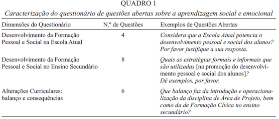 Considerando a especificidade da temática, foi utilizado um questionário com questões abertas, criado de raiz para este estudo, que abordava a temática da aprendizagem social e emocional, a partir de questões sobre o seu desenvolvimento no contexto escolar atual, a sua dinamização e práticas no ensino secundário, bem como o balanço e as consequências das alterações curriculares em curso (cf. Quadro 1).