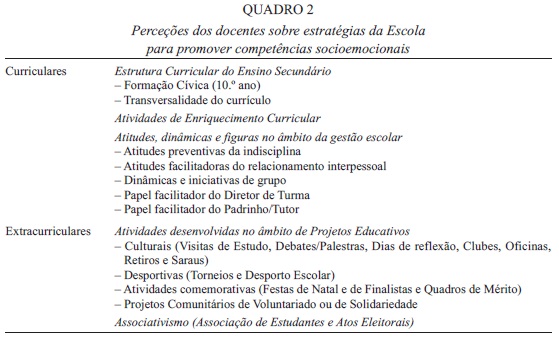 Ao nível do ensino secundário, muito particularmente, o discurso dos docentes reflete a função prioritária da Escola de transmissão dos saberes ditos essenciais, logo, curriculares, relegando para segundo plano a promoção de competências sociais e emocionais (Greenberg et al., 2003). A subvalorização destas áreas parece, no geral, ser assumida pelos docentes, que afirmam não existir uma abordagem mais produtiva desta área, nomeadamente pela ausência de estrutura e organização curriculares vocacionadas para o seu desenvolvimento.