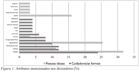 Já no que concerne aos atributos exclusivos nos dicionários das pessoas idosas e dos cuidadores/as formais, verificamos que há um maior campo semântico quando comparamos os atributos exclusivos dos funcionários (oito palavras diferentes) com o dos idosos (cinco palavras diferentes). Facto que não será alheio às habilitações literárias destas duas amostras (Figura 3).
