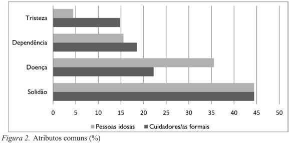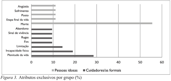 Os inquiridos fazem referência a dois atributos: “plenitude da vida” e “morte”. Os cuidadores/as formais representam a velhice como a plenitude da vida, enquanto as pessoas idosas como morte. Duas evocações que poderão remeter ao mesmo campo representacional se a significação da plenitude de vida se associar à vida completa.