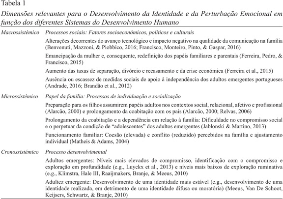 Ao nível macrossistémico (Tabela 1), realça-se a influência dos processos sociais (e.g., fatores sociais, económicos, políticos e culturais) no ajustamento psicológico e no desenvolvimento da identidade. Neste sentido, é de realçar as alterações familiares, nomeadamente do ponto de vista da estrutura, papéis e configuração familiar (Benvenuti et al., 2016; Francisco et al., 2016), que desempenham um papel importante na emergência de perturbações psicológicas.