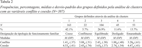 A Tabela 2 apresenta os perfis dos clusters identificados em relação às perceções do funcionamento familiar. A análise de variância multivariada revelou um efeito significativo dos clusters nas variáveis coesão e conflito [F(2,381)=248.35, p<.01, ηp2=.72]. As análises subsequentes sobre os efeitos univariados (e.g., ANOVAs) revelaram que as diferenças entre os grupos são significativas [Fcoesão(4)=49.01, p<.001, ηp2=.72; Fconflito(4)=58.38, p<.001, ηp2=.77].