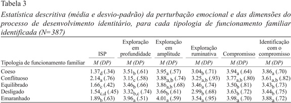 A Tabela 3 apresenta as pontuações médias e os desvios-padrão dos processos de desenvolvimento identitário e de perturbação emocional para cada tipologia de funcionamento familiar identificada. As diferenças significativas entre os grupos foram analisadas através do teste Duncan, tal como foi referido.