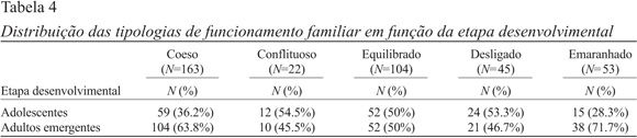 Através da Tabela 4 observou-se que: das 163 famílias com um funcionamento Coeso, 59 (36.2%) são famílias com filhos adolescentes e 104 (63.8%) são famílias com adultos emergentes; das 22 famílias com um funcionamento Conflituoso, 12 (54.5%) são famílias com filhos adolescentes e 10 (45.5%) são famílias com adultos emergentes; nas 104 famílias com um funcionamento Equilibrado a frequência de famílias com filhos adolescentes e com adultos emergentes é equivalente (n=52; 50%); nas 45 famílias com um funcionamento Desligado, 24 (53.3%) são famílias com filhos adolescentes e 21 (46.7%) são famílias com adultos emergentes; por último, das 53 famílias com um funcionamento Emaranhado, 15 (28.3%) são famílias com adolescentes e 38 (71.7%) são famílias com adultos emergentes. Com base nos odds ratio (Field, 2009) a probabilidade de pertencer a uma família com um funcionamento: Coeso é 1.51 vezes superior se for adulto emergente; Conflituoso é 1.6 vezes superior se for adolescente; Equilibrado é 1.57 vezes superior se for adolescente; Desligado é 1.7 vezes superior se for adolescente; e Emaranhado é 2 vezes superior se for adulto emergente.