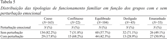 Foi encontrada uma associação significativa entre a tipologia de funcionamento familiar e o nível de perturbação emocional [χ2(4)=41.456, p<.001]. A Tabela 5 apresenta a distribuição das tipologias de funcionamento familiar em função dos grupos com e sem perturbação emocional.