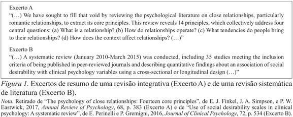 A título de exemplo, a Figura 1 ilustra dois excertos do resumo de duas revisões diferentes. Enquanto o resumo da revisão narrativa ou tradicional (excerto A) não explicita o método de revisão, o resumo da revisão sistemática (excerto B) demonstra a clareza esperada em relação ao método da pesquisa, baseado num protocolo que define à priori critérios de inclusão/exclusão e a estratégia de pesquisa da literatura.