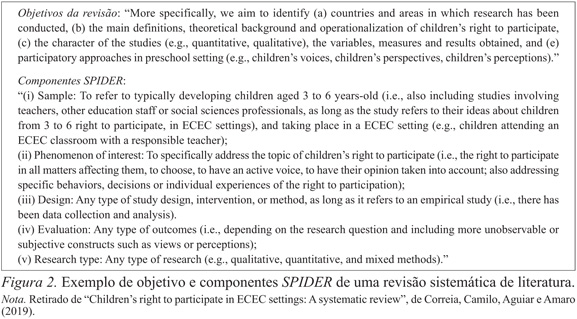 Quando o propósito da revisão implica a inclusão de estudos qualitativos ou mistos, será mais adequada a utilização da estratégia SPIDER (Sample, Phenomen of Interest, Design, Evaluation and Research Design; Cooke, Smith, & Booth, 2012). O SPIDER, exemplificado na Figura 2, dá suporte na definição dos seguintes componentes: S – Amostra, cujo significado se aplica melhor aos estudos qualitativos em comparação com o termo “população” que remete mais a pesquisa para estudos epidemiológicos, mais comuns na Medicina, por exemplo; PI – Fenómeno de interesse,que deverá incluir tópicos relativos a comportamentos, experiências ou intervenções; D – Desenho/método de investigação dado que, na investigação qualitativa, a abordagem teórica determina o método de investigação utilizado que, ao ser incluído especificamente na estratégia de pesquisa, aumenta a probabilidade de deteção dos estudos de interesse; E – Avaliação, que diz respeito aos resultados dos estudos; R – Tipo de investigação, dado que esta ferramenta se adequa a estudos quantitativos, qualitativos e métodos mistos (para uma descrição detalhada ver Cooke et al., 2012).