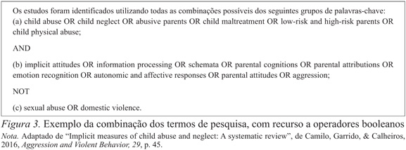 Para a combinação dos termos de pesquisa são geralmente utilizados operadores lógicos de pesquisa ou operadores booleanos, que permitem combinar de formas diferentes as palavras ou grupos de palavras, modificando assim os resultados da pesquisa. Os operadores booleanos mais comuns são os seguintes: “AND”, utilizado para procurar artigos que incluam todas as palavras identificadas; “OR”, para procurar artigos que incluíam qualquer uma das palavras identificadas; e “NOT”, utilizado para excluir artigos que incluam determinada palavra (Cronin et al., 2008; Reed & Baxter, 2009). Alguns termos de pesquisa podem ainda ser truncados utilizando um asterisco a seguir à última letra comum a várias formas da palavra. Por exemplo, singular e plural (utilizar child* para child e children) ou outras palavras relacionadas (childhood). Também é aconselhado o uso de aspas quando nos referimos a uma expressão ou conjunto de palavras, como por exemplo “cognição social”, pois se colocarmos as duas palavras separadas, é possível que algumas bases de dados considerem os dois termos de forma independente. A utilização de grupos de palavras-chave é também uma importante estratégia para refinar os resultados de pesquisa, combinando qualquer palavra de um tópico específico com qualquer palavra de outro tópico (ver Higgins & Green, 2011). O exemplo da Figura 3 ilustra a utilização de operadores booleanos e de grupos de termos de pesquisa.