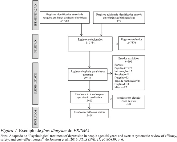 Após obtidas todas as referências identificadas pela pesquisa nas bases de dados e outras fontes de informação, importadas e organizadas num dos softwares referidos anteriormente, dá-se início ao processo sequencial de seleção dos artigos a incluir na revisão sistemática de literatura. Para apoiar e sintetizar este processo, o PRISMA Statement oferece o flow diagram, uma ferramenta para a apresentação dos resultados da revisão sistemática. O flow diagram é constituído por 4 fases: (a) a identificação dos artigos, onde deve ser referido o número total de artigos retidos na pesquisa em bases de dados eletrónicas, o número total encontrado na pesquisa manual e, por último, o número final depois de removidos os duplicados; (b) a triagem dos artigos, sendo esta a primeira fase de seleção realizada com base no título e resumo (e, sempre que existam dúvidas nesta fase, o manuscrito deve ser incluído para a fase seguinte), e deverá ser referido o número de artigos excluídos (não é necessário identificar, nesta fase, os motivos de exclusão); (c) a elegibilidade dos artigos, a partir da sua leitura integral são selecionados com base nos critérios de elegibilidade os artigos a incluir na revisão e os artigos a excluir (referindo as razões de exclusão de cada artigo); (d) a inclusão dos artigos, apresentando o número final de estudos incluídos para a síntese qualitativa e, caso se aplique, para a síntese quantitativa (meta-análise). Geralmente, as revisões sistemáticas de literatura incluem apenas artigos empíricos ou de resultados de intervenção, sendo importante nesta etapa que as revisões de literatura ou meta-análises que surjam na pesquisa de artigos sejam integradas no enquadramento teórico e/ou na discussão de resultados da revisão sistemática. A Figura 4 apresenta um exemplo do flow diagram de um artigo de revisão sistemática.