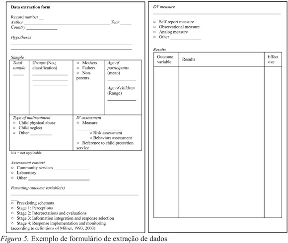 Os mecanismos de codificação dos dados podem assumir várias formas, sendo que a codificação direta num formulário em papel (ver exemplo na Figura 5) pode ser uma opção melhor para revisões com poucos estudos (dado que é necessário introduzir depois os dados numa base de dados), ou codificar diretamente para uma base de dados eletrónica (e.g., Microsoft Access ou Excel) (Wilson, 2009).