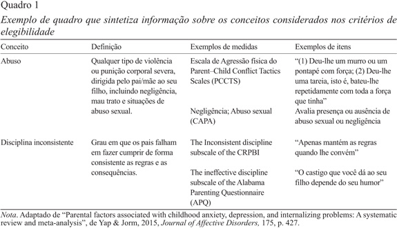 Especificamente, é necessário definir dois conjuntos de critérios de inclusão: a) os critérios de inclusão relativos aos estudos em si, isto é, as características dos estudos (variáveis, participantes, desenho de investigação), que poderão ser definidos com base nos componentes PICOS ou SPIDER; e b) os critérios de inclusão relativos às publicações dos estudos a incluir, isto é, o idioma da publicação, o tipo de publicação (e.g., inclusão de artigos com revisão por pares, material não publicado) e o ano de publicação (Liberati et al., 2009). Atkinson e colegas (2015) referem ainda a importância de clarificar as definições de conceitos nos critérios de elegibilidade, como exemplificado no Quadro 1.