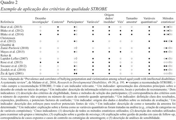 A avaliação da qualidade dos estudos passa então por definir um conjunto de critérios de avaliação de acordo com a questão de investigação, que pretende discutir a correspondência entre os métodos e inferências dos estudos incluídos (Cooper, 2016). Existem já um conjunto de instrumentos estandardizados, como escalas ou checklists que permitem questionar a validade interna e externa de cada um dos estudos (e.g., Higgins & Green, 2011). Por exemplo, a Cochrane Collaboration disponibiliza um conjunto de critérios para sínteses de ensaios clínicos (Higgins & Green, 2011) e outros institutos de investigação, como o Joanna Briggs Institute, têm disponíveis online gratuitamente checklists de critérios de qualidade para vários tipos de estudos (http://joannabriggs.org/research/critical-appraisal-tools.html) que auxiliam os investigadores nesta análise qualitativa da investigação. Outro exemplo que pode ser útil para os investigadores na área da Psicologia são os critérios STROBE (Vandenbroucke et al., 2007; https://www.strobe-statement.org/), direcionados para estudos observacionais. No Quadro 2 apresentamos um exemplo da aplicação dos critérios STROBE numa revisão sistemática na área da Psicologia (Maïano, Aimé, Salvas, Morin, & Normand, 2016).