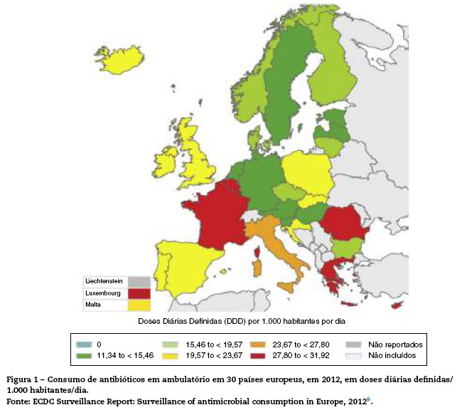 Segundo os dados divulgados no relatório «European Centre for Disease Prevention and Control (ECDC) Surveillance Report: Surveillance of antimicrobial consumption in Europe, 2012», existe uma grande variabilidade no consumo de antibióticos na Europa, avaliado em doses diárias definidas (DDD) /1.000 habitantes /dia (DHD)9. O país com maior consumo de antibióticos, a Grécia (31,9 DHD), apresenta um valor em DHD cerca de 3 vezes superior ao país com menor consumo, a Holanda (11,3 DHD). Observa-se também que o maior nível de consumo de antibióticos ocorre nos países do sul da Europa, comparativamente com os países do norte da Europa (fig. 1)9.