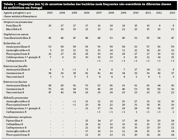 A tabela 1 apresenta dados do Centro Europeu de Prevenção e Controlo de Doenças relativos aos perfis de resistência microbiana em Portugal, nos anos de 2003-201347.
