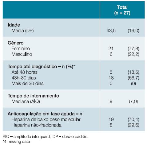 Em relação ao tratamento, todos os doentes realizaram anticoagulação em fase aguda, tendo sido administrada heparina de baixo peso molecular em 19 doentes e heparina não fraccionada em oito doentes. Em 25 doentes foi feito switch para antagonista da vitamina K à data de alta. Um doente suspendeu anticoagulação por complicação hemorrágica e outro doente manteve heparina de baixo peso molecular. Nenhum foi submetido a intervenção endovascular nem craniectomia descompressiva.
