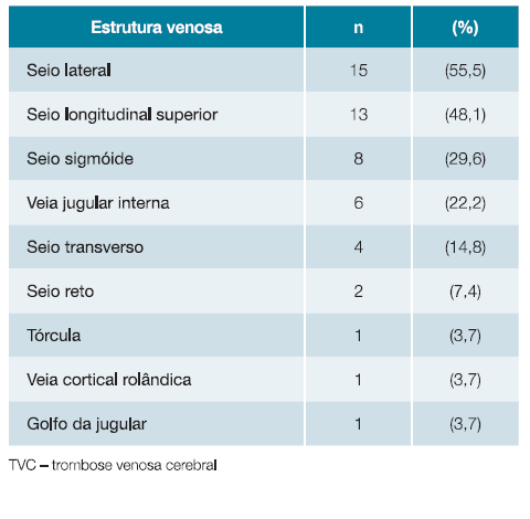 Em termos de localização da trombose venosa (Tabela 2), 13 casos (48, 1 %) tinham envolvimento apenas de uma estrutura e 14 (51,9%) tinham envolvimento de duas ou mais estruturas venosas profundas e/ou superficiais. O seio lateral foi o mais frequentemente afetado, com 15 (55,5%) casos, seguido do seio longitudinal superior, com 13 casos (48, 1 %); 8 casos (29,6%) tiveram trombose do seio sigmóide, 6 casos (22,2%) da veia jugular interna, 4 casos (14,8%) do seio transverso, 2 casos (7,4%) do seio reto e, por fim, 1 caso cada (3,7%) teve trombose da tórcula, de uma veia cortical rolândica e do golfo da jugular.