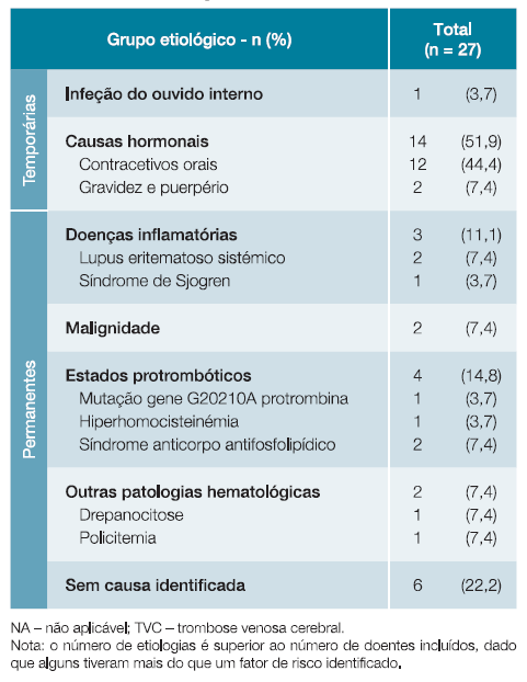 Em seis doentes (22,2%) não foi encontrado nenhum fator etiológico. Em relação a esta percentagem elevada de doentes sem etiologia identificada, verificámos que apenas quatro dos seis doentes completaram seguimento em consulta de Neurologia, com estudo negativo para fatores predisponentes de TVC. Os outros dois doentes abandonaram o seguimento em consulta antes de concluído o estudo.