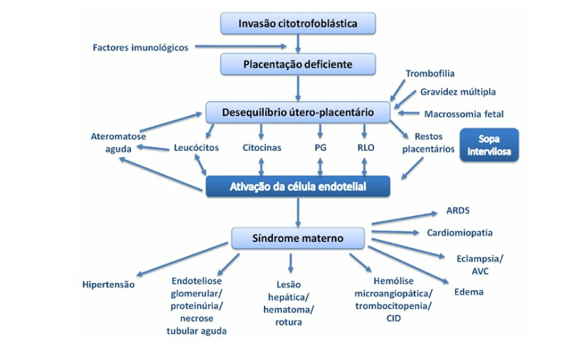 A PE tem sido vista cada vez mais como uma doença sistémica, e não apenas um distúrbio hipertensivo da gravidez. Tal como ilustrado na Fig. 1, patogenicamente é comparada a um desequilíbrio entre o fornecimento sanguíneo uteroplacentário e as necessidades fetais - a principal característica é uma alteração no remodeling da artéria espiral da placenta, de tal forma que há restrição do fluxo sanguíneo placentar e diminuição da perfusão útero-placentar, com consequente restrição de crescimento e libertação de citocinas pro-inflamatórias e fatores antiangiogénicos que são libertados para a circulação materna com alteração de toda a hemodinâmica local. Tudo isto culmina na disfunção endotelial sistémica no leito vascular materno (associado a intenso stress oxidativo), no desequilíbrio de vários fatores angiogénicos, e na alteração da perfusão de órgãos (com vasospasmo, ativação das plaquetas e do sistema de coagulação e formação de micro-trombos).9,10