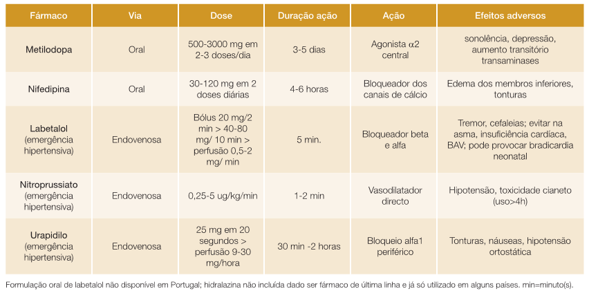 Na grávida hipertensa a abordagem farmacológica inicial, tendo em conta os fármacos disponíveis na formulação oral no nosso país, passa essencialmente por duas opções base: metildopa ou bloqueadores dos canais do cálcio, nomeadamente nifedipina e amlodipina (Tabela 3) - o labetalol não tem formulação oral comercializada em Portugal.