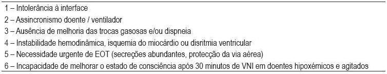 Existem algumas contraindicações ao uso de VNI (Quadro II); a mais importante a ter em conta é a indicação para VMI (ventilação mecânica invasiva). O maior risco na instituição deste método é o de atrasar o momento óptimo para EOT e VMI, razão pela qual o técnico que a institui deve estar bem familiarizado com as diferentes condicionantes de sucesso e insucesso da mesma.