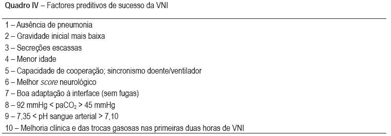 Alguns dos factores preditivos de sucesso da VNI relacionados com a apresentação inicial do doente são enumerados no Quadro IV.
