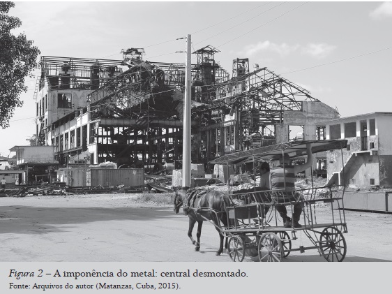 A menção inicial ao “tempo morto” não é desinteressada. Soube já nos primeiros dias de pesquisa que o batey estava distante do competitivo circuito de safras, acompanhado com frequência pela mídia do governo. Tudo ali, como exclamavam, estava “parado”, “sem vida”. A velha e enferrujada estrutura de ferro do central estava, como num esqueleto, exposta, o que conferia uma atmosfera de decrepitude. As torres (chaminés) encontravam-se frias, não emitiam nenhum sinal que lembrasse os dias de intensa atividade nas caldeiras, quando exalavam grandes nuvens de fumaça – lembrança resguardada, como patrimônio açucareiro, em fotografias de um pequeno museu local. Pelas ruas empoeiradas e estradas de terra mais próximas, havia pedaços de peças já inutilizadas, parafusos, tanques e trilhos de trem carcomidos.