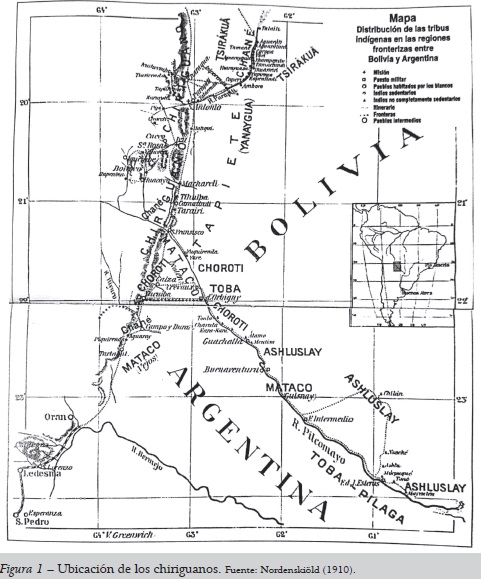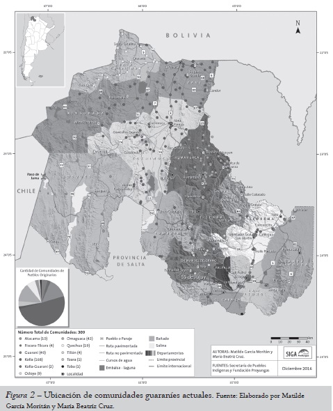 Los guaraníes de la región son referidos, en las fuentes y en la literatura etnohistórica, como chiriguanos. En mi trabajo elijo el término guaraní que es con el que se auto-identifican mis interlocutores y solo utilizaré el etnónimo chiriguano al referirme a las corrientes historiográficas y etnográficas que así los denominan. Los guaraníes de Jujuy (NOA) forman parte de un pueblo amerindio de ascendencia tupí-guaraní,[8] cuyo territorio corresponde a las estribaciones surorientales de los Andes en los confines occidentales del Gran Chaco. Los numerosos pueblos de la gran familia lingüístico-cultural tupí-guaraní se encuentran extendidos por vastas regiones del continente americano (en los países de Argentina, Bolivia, Brasil y Paraguay fundamentalmente).