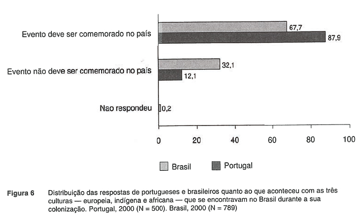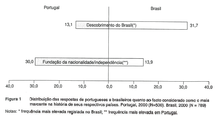 Para balizar o exame dos resultados alcançados conviria, inicialmente, destacar os graus diferenciados de importância atribuídos por sujeitos brasileiros e portugueses ao facto histórico do descobrimento do Brasil. Quando solicitados a indicar os três factos mais marcantes da história de Portugal, 30,6% dos sujeitos portugueses citaram espontaneamente o descobrimento do Brasil. Já entre os brasileiros, como seria de esperar, os resultados do estudo revelam que o percentual dos que situam o descobrimento do Brasil no conjunto dos três factos mais marcantes da história de seu país foi expressivamente maior, chegando a 61,7%.