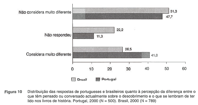 Embora o conhecimento sobre o descobrimento do Brasil tenha sido obtido pelos brasileiros por meio do acesso a diferentes fontes, as quais adoptam modos inteiramente diversificados de tratamento da informação, o estudo revelou, como consubstanciado na figura 10, que metade da amostra brasileira, tanto quanto da portuguesa, não percebia muita diferença entre o que se falava então sobre o descobrimento e o que se lembrava de ter lido nos manuais escolares.