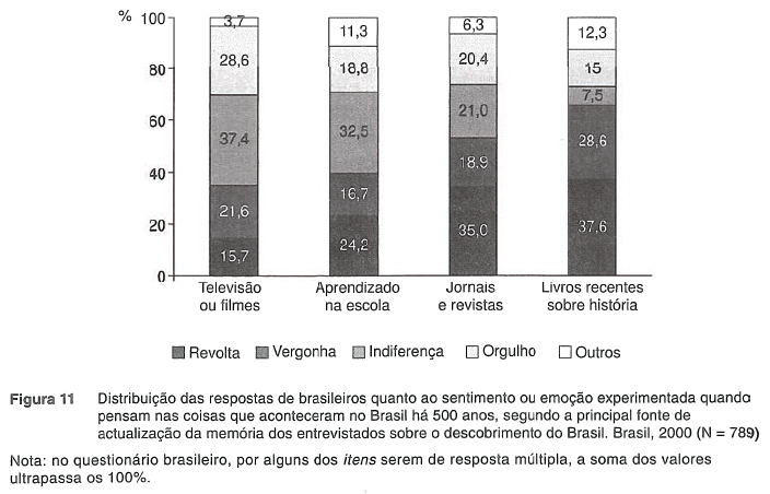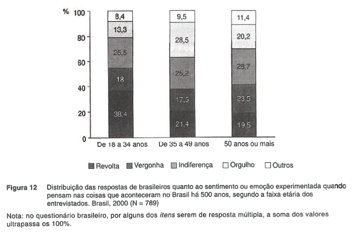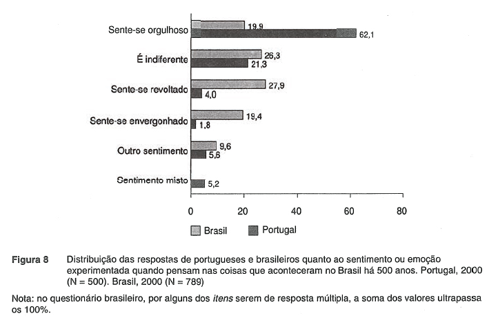 Os resultados precedentes parecem explicar porque os brasileiros — mais do que os portugueses — experimentavam sentimentos de revolta ou vergonha quando pensavam nos factos ocorridos há 500 anos no Brasil. De facto, enquanto os portugueses sentiam-se principalmente orgulhosos ou, em menor proporção, indiferentes em relação a esses acontecimentos remotos, os brasileiros, de acordo com figura 8, se distribuíam entre a revolta e a vergonha, além do orgulho e da indiferença.