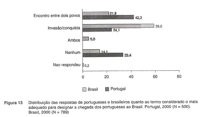 Não parece ser por outro motivo que o termo considerado o mais adequado para designar a chegada dos navegadores portugueses ao Brasil tenha sido, segundo a amostra brasileira, "invasão ou conquista", contrariamente aos sujeitos portugueses, cuja preferência recaiu sobre o termo "encontro entre dois povos", como mostra a figura 13.