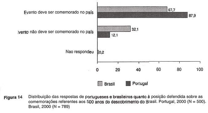 Embora tenham destacado aspectos negativos relacionados ao descobrimento, brasileiros e portugueses consideraram que o evento deveria ser comemorado. A figura 14 revela que a quase totalidade dos portugueses e dois terços dos brasileiros mostraram-se favoráveis à comemoração do descobrimento do Brasil nos respectivos países.