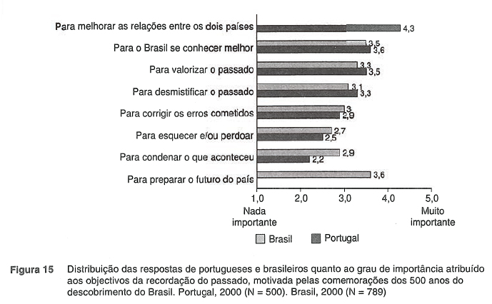 Finalmente, a figura 15 mostra em que grau brasileiros e portugueses consideraram que os objectivos de recordação do passado foram importantes nas comemorações do quinto centenário do descobrimento do Brasil.
