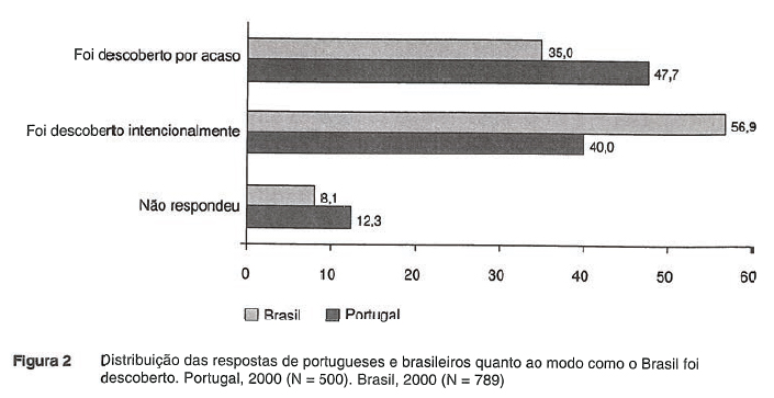 Uma outra questão abordada pelo estudo diz respeito ao modo pelo qual o Brasil teria sido descoberto. Os resultados, mostrados na figura 2, revelam que a tese do acaso do descobrimento predominava em Portugal, enquanto que no Brasil a tese da intencionalidade parecia ter maior aceitação.