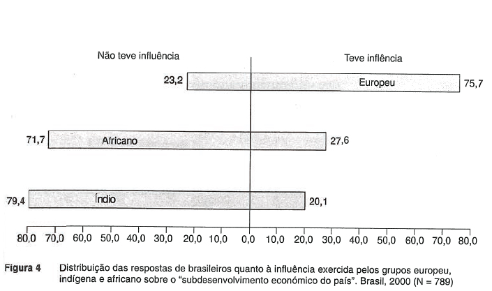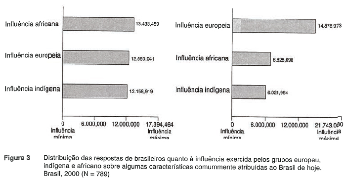 Por meio de um sistema de pontuação que creditava um ponto a cada grupo — europeu, indígena ou africano — toda vez que este era responsabilizado por uma característica, o estudo constatou, como mostra a figura 3, que o grupo europeu foi considerado como o que mais exerceu influência sobre as características desfavoráveis atribuídas ao Brasil de hoje.
