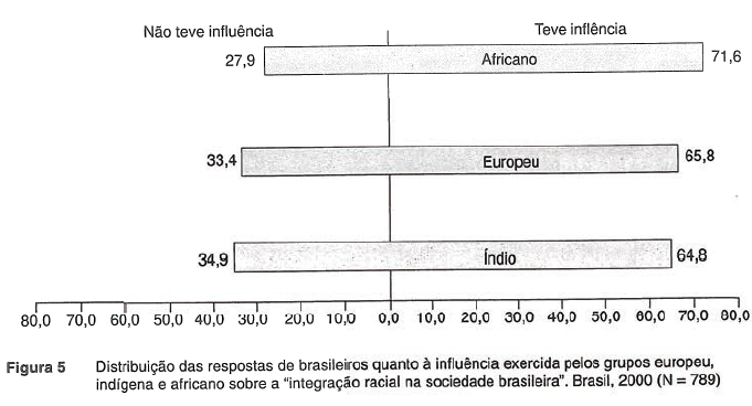 Mas, como evidencia a figura 5, os brasileiros também foram capazes de reconhecer méritos decorrentes do processo de colonização europeu, como, por exemplo, "a integração racial na sociedade".