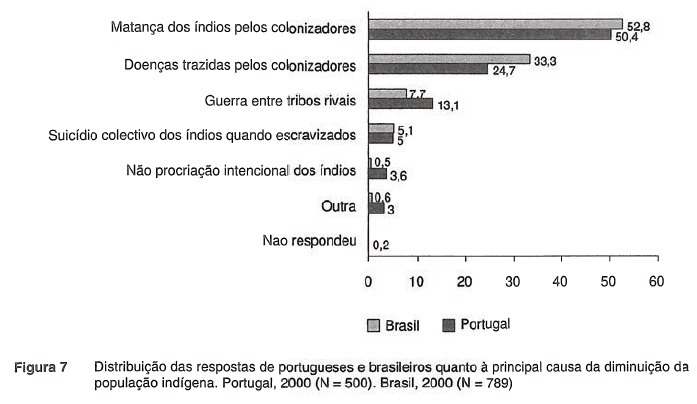 Muito embora os resultados apontem para o reconhecimento — por parte de portugueses e brasileiros — do carácter integrativo do processo de colonização do Brasil, os sujeitos da pesquisa pareciam não acreditar que esta integração tenha se dado de modo pacífico. Como demonstra a figura 7, metade dos portugueses e brasileiros consideraram "a matança dos índios pelos colonizadores" como a principal causa apontada para explicar a redução da população indígena. Quanto aos outros motivos apontados para explicar tal redução, os portugueses — comparativamente aos brasileiros—pareceram ter pouca simpatia por explicações que aumentassem sua responsabilidade neste processo, como "doenças trazidas pelo colonizador", preferindo explicações que transferissem a responsabilidade pelo extermínio às próprias vítimas, como a "guerra entre tribos rivais" ou a "não procriação intencional dos índios".