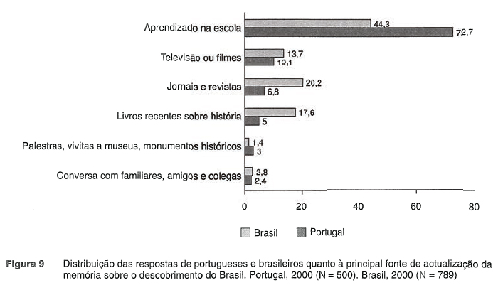 Conforme a figura 9 revela, para os portugueses a principal fonte de representações do descobrimento foi o aprendizado na escola, seguido da televisão, que foram também fontes importantes para os brasileiros, mas em menor grau, pois jornais, revistas e livros recentes contribuíram igualmente para a actualização da sua memória.