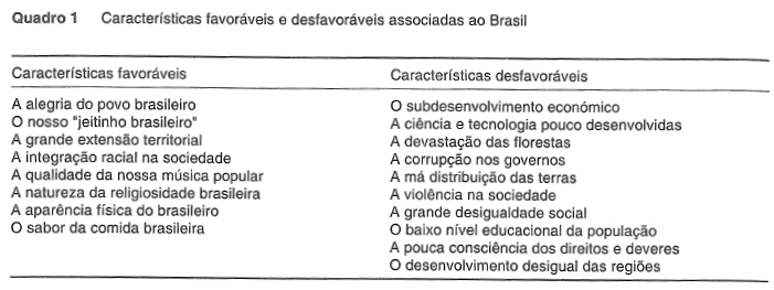 O estudo interessou-se também em saber em que medida as influências europeia, indígena e africana são creditadas pelos brasileiros a algumas características comummente atribuídas ao Brasil de hoje. Foram apresentadas à amostra brasileira algumas destas características, tanto favoráveis quanto desfavoráveis. O quadro 1 apresenta este conjunto de características.