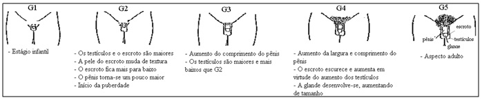 Figura 3. Estágios de desenvolvimento dos genitais (a avaliação pode ser feita por um médico ou por meio da autoavaliação; adaptado de Morris & Udry, 1980)