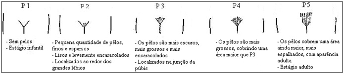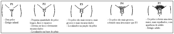 Figura 4. Estágios de pilosidade pubiana masculina (a avaliação pode ser feita por um médico ou por meio da autoavaliação; adaptado de Morris & Udry, 1980)