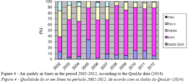As far as the quality of the air is concerned (Figure 4) the obtained results show, in general, a classification of “good” (APA, 2014). However, the issue of air quality in Sines became relevant during 2011 and 2012, when several episodes of a stench occurred, 657 complaints having been filed between January 2012 and October 2014 (CMS, 2014).