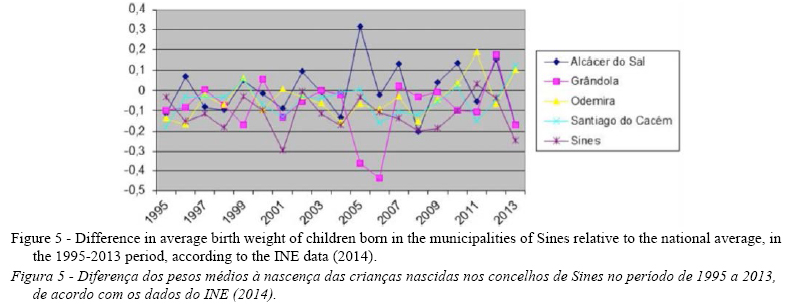 In this field, and according to the data of INE (2015), the children born between 1995 and 2013 in Sines and near-by municipalities present birth weights lower than the national average during this period, with a frequency of 95% of lower weights for Sines municipality (figure 5).