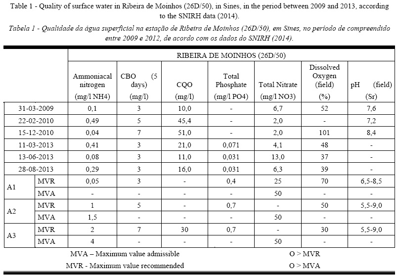 According to the environmental data available for the Sines region (Table 1), the quality of the surface waters mostly presents low levels of pollution (SNIRH, 2014). Concerning the quality of groundwater, eleven (11) measurements were carried out between 2007 and 2012 showing changes of the natural values in six (6) different parameters (SNIRH, 2014). On the quality of the coastal and transition waters, which have been monitored since 2008, the results for the whole Sines area present maximum quality (SNIRH, 2014).