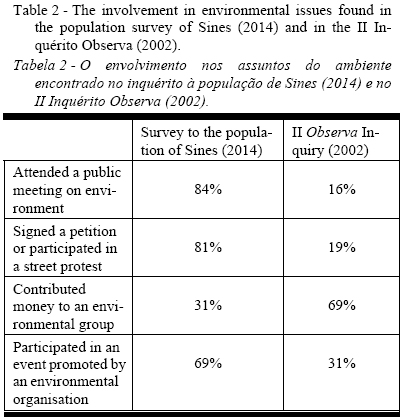 About their direct involvement (Table 2), the respondents are available to participate in environmental actions, even more than at national level, regarding the results obtained in 2002 (Nave, 2004). They were, however, identified barriers to a more effective participation, such as the lack of time or opportunity (67%), suggesting a certain incapacity or disclaimer of the respondents in protecting the environment (Castro, 2004).