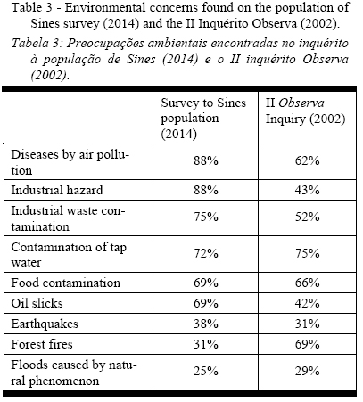 These results reveal an important concern of the re-spondents with environment and health, which is enhanced by the presence of the industrial sector in the daily lives of the population of Sines (Nave & Fonseca, 2004), thus confirming that the people who live closer to big industrial undertakings tend to stress the environmental risks more strongly (Langlois, 2012; Che et al.et al., 2013).