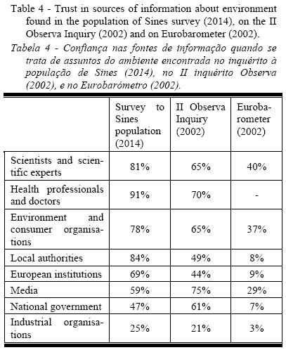 Regarding to accountability, the respondents show low trust in the institutions responsible for environmental management (Table 4), i.e. the State and the Companies. In this field, was noted trust in the regional public institutions and local authorities, as well as in the health professionals and scientific experts. The results now obtained, naturally reflect the social and local circumstances of the Sines area, where the proximity to the regional institutions is stronger. In the case of the media, there is a perceived high breach of trust compared to the national results of 2002 (Schmidt et al.et al., 2004), due to the critical thinking and higher environmental maturity of the Sines population (Torre, 2014), where this issues are a constant in the daily routine of the people.