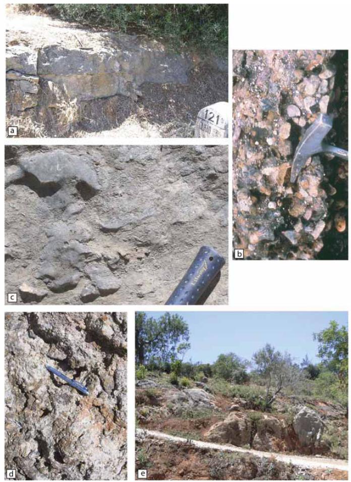 a: limestone from the Bias Formation; b: conglomerate of the Estói Formation; c: reefal limestone from the Bias Formation; d: sandstone in the lower part of the Costa Longa Formation; e: dolomites from the Costa Longa Formation.